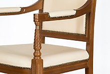 Габри-2 – кресло столярной, неразборной конструкции высокой комфортабельности из массива бука. Передние ножки точеные с канилюрами. Задние ножки - выпильные, криволинейные, фрезерованные по заданному профилю. Спинка кресла мягкая, прямоугольной формы. Кресло отличает наличие множества декоративных элементов ручной работы на передних ножках, царговом поясе и спинке, локотниках, что придает стулу элегантность и изысканность. Стул Габри-2 Характеристики Высота сиденья 480 мм Размеры (Ш х Г х В) 630x540x970 мм