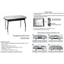 Стол Милтон - раздвижной обеденные стол с оригинальной столешницей с покрытием из прочного HPL-пластика с рисунком "Цветы лотоса" и механизмом раздвижения "Бабочка". Ноги стола с утонением и выполнены из стали с качественным долговечным покрытием Хром люкс или Эмалью..Основные размеры столешниц: 900 (1180) х 600 мм; 1100 (1400) х 700 мм; 1200 (1500) х 800 мм. Высота стола: 750 ммГлавные преимущества столов с HPL-пластиком перед стеклянными поверхностями:- износостойкость к механическим повреждениям (царапинам, сколам и т.д.)- ударопрочность (столешница не разобьётся при ударе)- высокое шумопоглащение (нет дребезжащих звуков при соприкосновении с посудой и т.д.)Варианты цветового исполнения стола (HPL-пластик / ЛДСП / Кромка)Белый Белый / БелыйКрасныйВенге / ВенгеКапучиноВенге / ВенгеЧерныйВенге / ВенгеЗеленыйВенге / ВенгеЛиловыйВенге / ВенгеОранжевыйВенге / ВенгеБежевыйБежев./ Бежев.ШоколадВенге / ВенгеСерый Белый / БелыйВарианты покрытия ножек:- Гальваническое ХРОМ ЛЮКС (никель-хром)- Порошковая окраска (ЭМАЛЬ)Варианты расцветки столешницы / Рисунок "Цветы лотоса"0029 Белый2007 Красный2024 Капучино2071 Черный2093 Зеленый2683 Лиловый8508 Оранж8510 Бежевый8514 Шоколад8608 Серый Информация по HPL-пластикуHPL-пластик – это современная разработка в мебельной промышленности. Декоративный бумажно–слоистый пластик (HPL) применяется в облицовке внутренних поверхностей в строительной и транспортной индустрии, для отделки ванных комнат, любых поверхностей медицинских учреждений, мастерских, мебельной промышленности. Основные достоинства HPL (HPL — High Pressure Laminate): - Высокая устойчивость к механическим повреждениям, высокая износостойкость и влагостойкость. - Высокая плотность материала препятствует проникновению загрязнений в структуру материала. - Стойкость к образованию пятен, стойкость к химикатам и к органическим растворителям. - Высокая термоустойчивость.